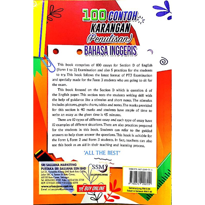 This book comprises of 100 essays for section d of english (form 1 to 3) examination and also .